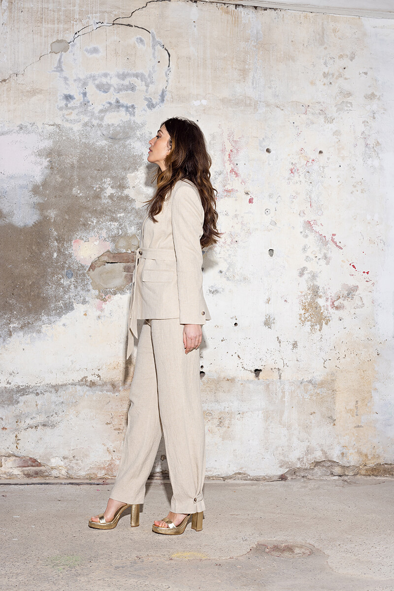 De blazer is gemaakt van een bijzondere linnen-mix met crinkle structuur en komt van een Italiaans stoffenhuis.