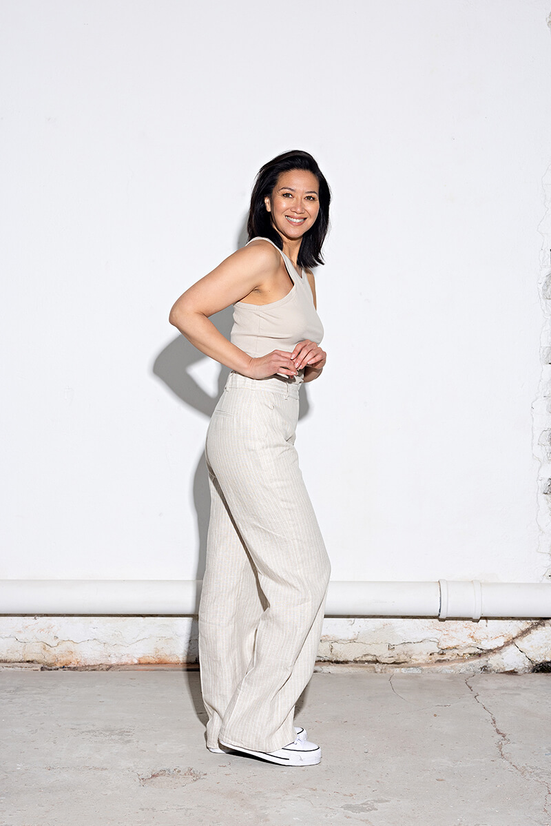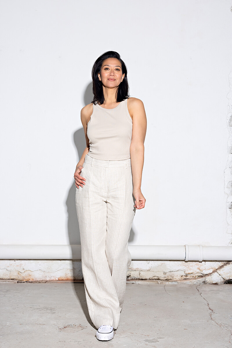 Deze rechte pantalon is gemaakt van 100% linnen van een Italiaans stoffenhuis, in een mooie kiezel kleur met een subtiele witte krijtstreep.
