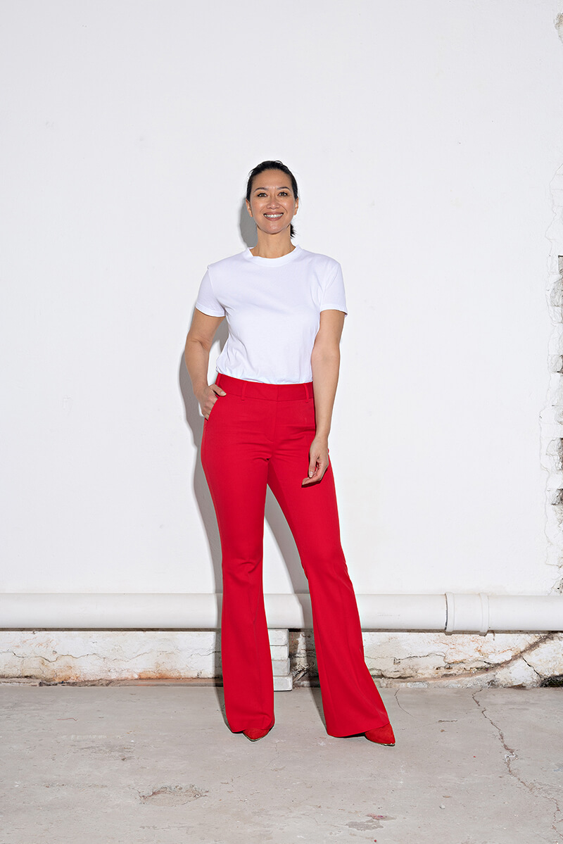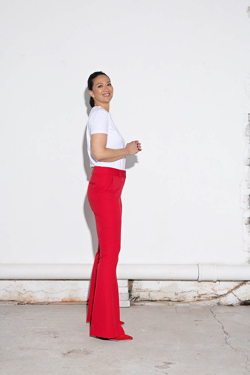 Fashionable and edgy flared trousers. With ironed pleat down the front. And fake welt pockets at the back.