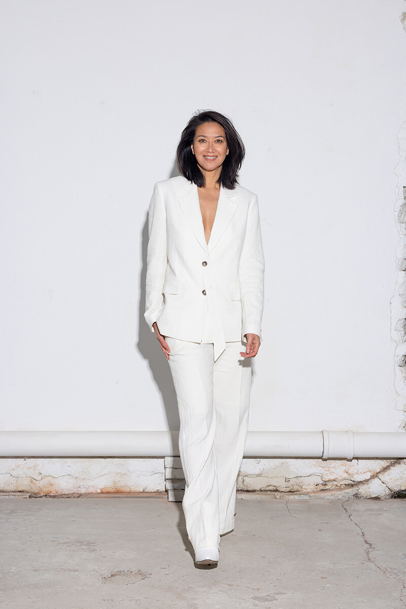 The blazer is made from a special linen-blend fabric with a crinkle structure from an Italian fabric house. The inside is made with cotton lining.