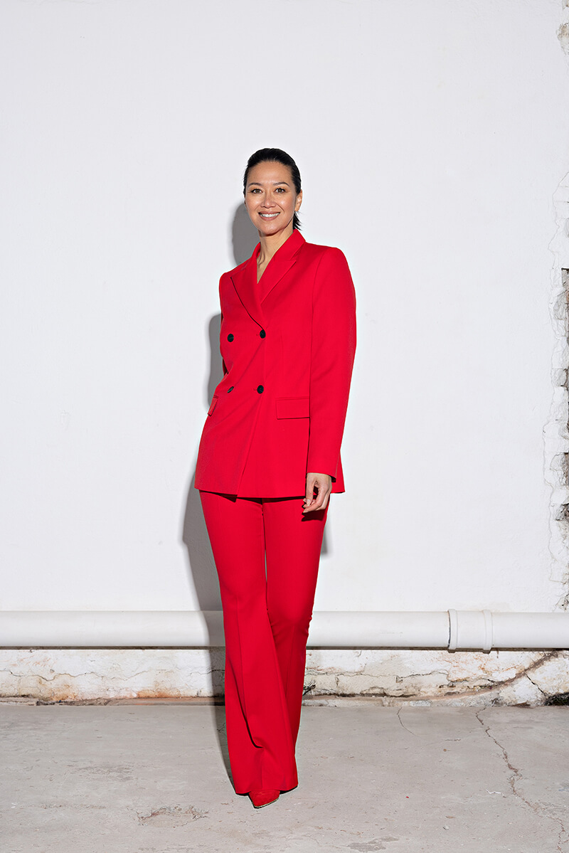 The model with the long brown hair is 180cm tall, is a size 38 and is wearing a size 38 in the picture.